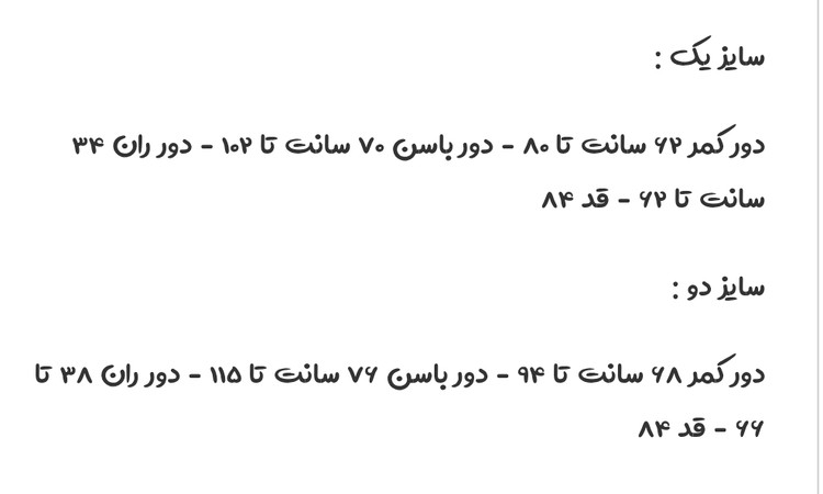 دور کمر ۶۲ سانت تا ۸۰ - دور باسن ۷۰ سانت تا ۱۰۲ - دور ران ۳۴ سانت تا ۶۲ - قد ۸۴